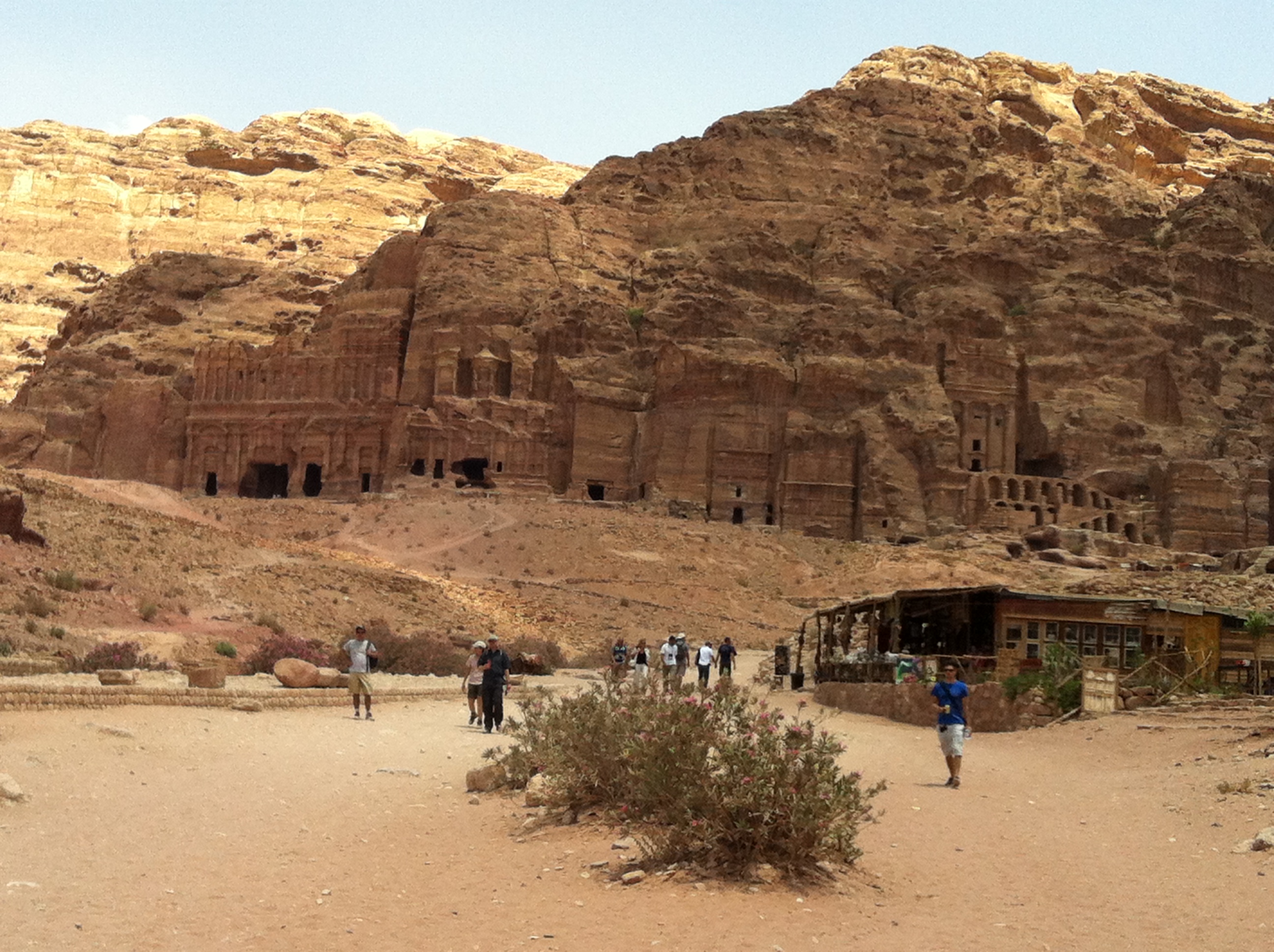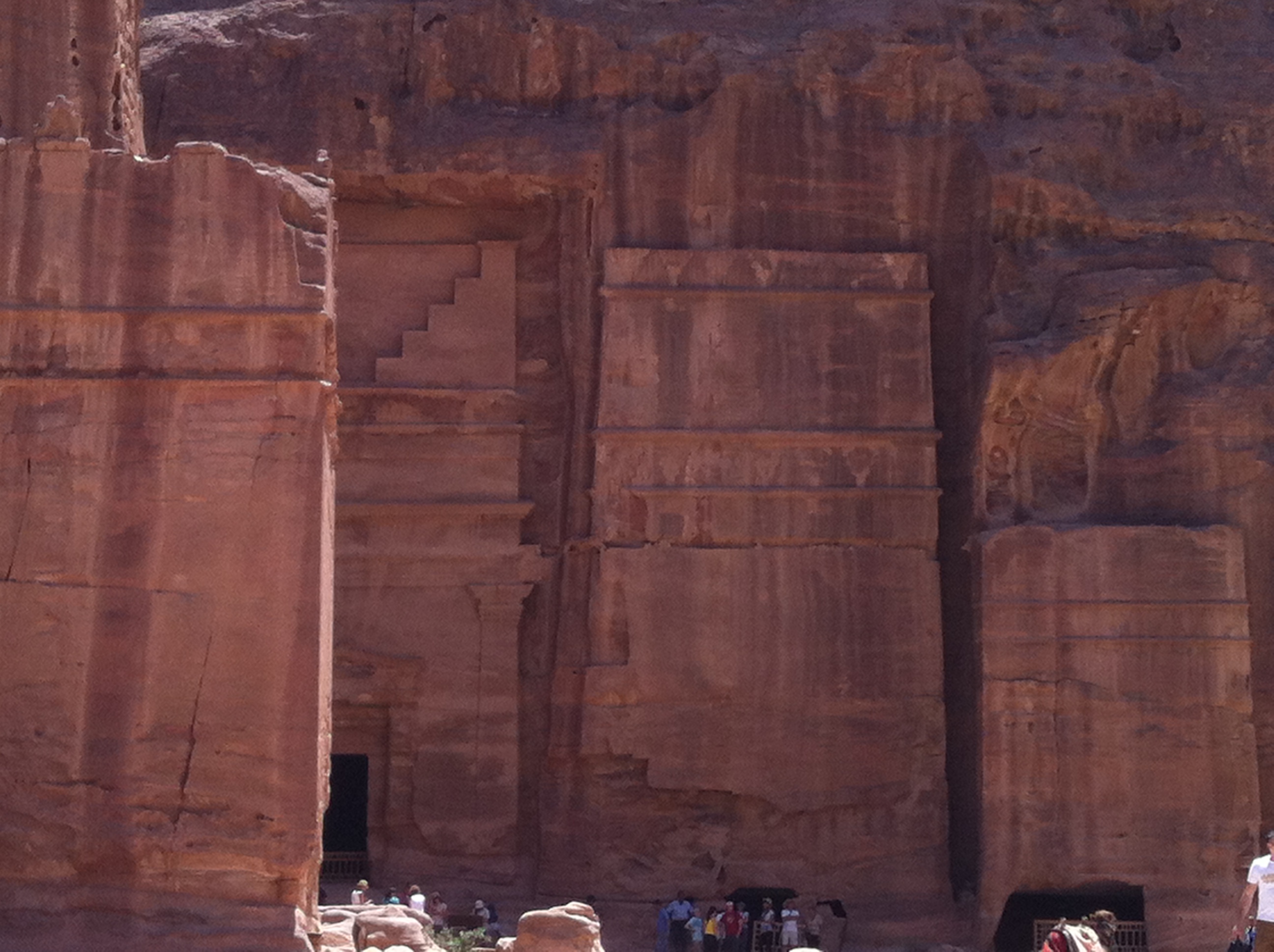 still to yield most of its secrets from under the sand, past the road of facades, the carved shrines to Dusharah, the chief god of the Nabateans, the carved camels and traders, the royal tombs, the fountain, the shopfronts, the three temples and the main Roman street and amphitheatre, the water channels for irrigation and drinking water cut right along the way, was hard but mind-blowing. We tramped along Roman limestone pavements, risking our balance as we gazed up the sandstone heights on either side to see yet another treasure – the djinn tombs, and the crow stepped tombs to allow the dead occupants to climb up and down from heaven.