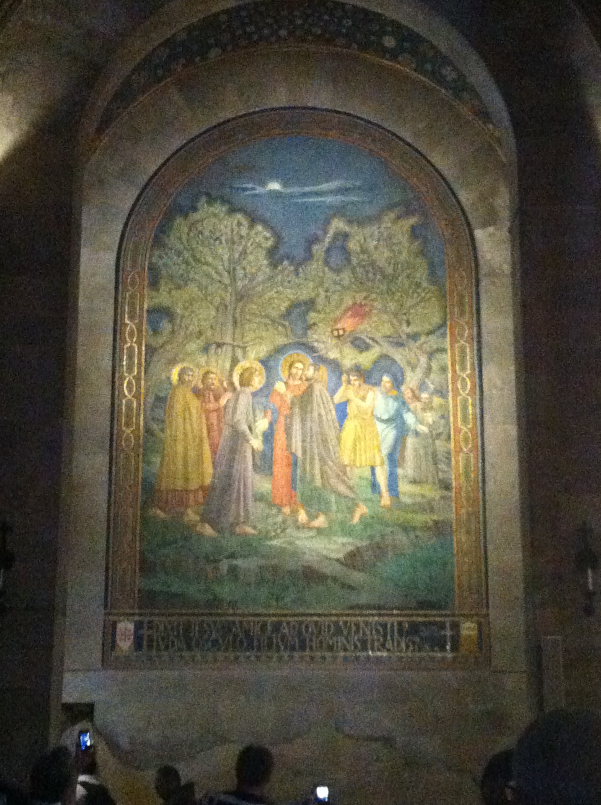 We went on to the Church of all Nations beside the Garden of Gethsemane. A mass was being said in Spanish as we entered, the rock exposed before the altar, said to be where Jesus prayed, and above – high on the walls of the dark church, floodlit mosaics of Judas’ kiss in the Garden, and of Jesus in prayer with his disciples sleeping.